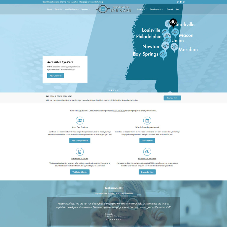 To successfully streamline this marketing mission, we overhauled their online portal to potential and returning clients, constructing a new website. This revamped online presence incorporated original messaging and graphics, but brought chic features, and flair, to the forefront. With a modern website in their marketing toolkit, Mississippi Eye Care has a place to better showcase their work and services, along with a way to attract prospective clientele.